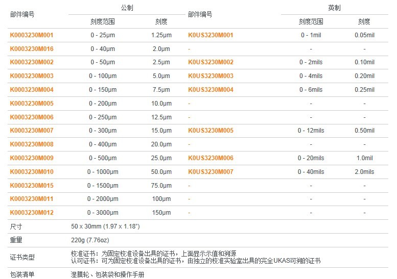 0 至 25μm 和 0 至 3000μm (0 至1mil 和 0 至 40mils) 幾種不同的測量范圍可選。連續刻度,測量精確度為 ±5%