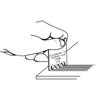 將濕膜梳插入粉末涂層,并沿著表面滑動。測量點(齒部)是尖的,使得粉末可在齒部周圍流動。粉末的厚度是在拖痕中最高值和無拖痕中的最低值之間。注:固化前涂層的厚度和固化后的值不一樣,但具有關聯性。粉末膜厚梳適合僅作參考用。